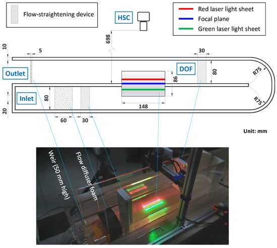 An open-circulated, U-shaped water channel made of acrylic plates, as shown in Figure 5, was constructed to generate a stratified crossflow condition in high-speed photography such that the proposed algorithm can be tested on a realistic fluid flow. As demonstrated in the top-view drawing and photo in Figure 5, the inflow goes rightward, and makes a U turn at the other end of the channel. Then the flow goes leftward all the way to the channel outlet. Flow straighteners were installed before the region of interest to ensure the flow uniformity. An additional flow diffuser foam was placed close to the inlet for mitigating the violent pipe inflow. Before the outlet, a weir of 50 mm high was installed for maintaining certain water level inside the channel.