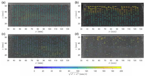 One major advantage of the imaging-based velocimetry technique is the capability of measuring turbulent flows, deriving quantities, such as velocity fluctuation, turbulent kinetic energy dissipation, and so on. In order to evaluate those quantities, instantaneous full-field velocity fields must be known. The instantaneous flow fields corresponding to the 1st peak, as shown in Figure 6b,c, may meet the requirement if an appropriate interpolation method (cubic spline or Kriging) is adopted to fill the missing vectors removed by the filtering post-processing. However, the same may not be applicable to velocity fields corresponding to the peaks other than the 1st peak since more missing vectors appear. Most of those missing vectors are associated with the unfavorable correlation peak recognition caused by the blockage or connection of the tracer image. Figure 6d and Figure 10a,b serve as an excellent example for the description. In this case, the valid vectors are too sparse for the interpolation purpose with confidence. Therefore, the new algorithm is only possible to measure the turbulent stratified flow field corresponding to the 1st peak, but not the flow fields corresponding to other peaks. In spite of that, the new algorithm is still useful in obtaining further velocity information from turbulent or transient stratified crossflows, particularly in field measurements or large-scale experiments with more limitations in instrumentation. The velocity information corresponding to other peaks may fail to reveal the full quantitative flow structure but be able to provide valuable measured data for certain purposes, such as validation, indication, or observed input to data assimilation.