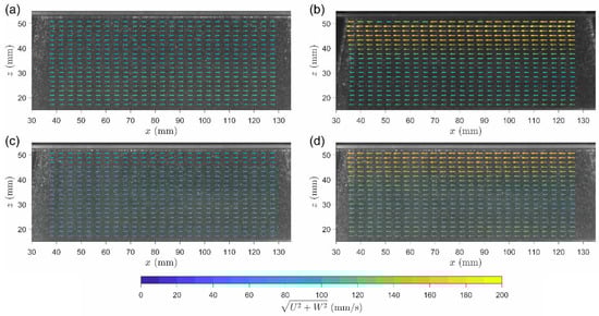 Time-averaged velocity maps determined by typical PIV analysis and the proposed algorithm. (a) case PIVR, (b) case PIVG, and result corresponding to the (c) 1st peak and (d) 2nd peak in case PIVB.
