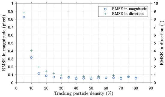 RMSEs in magnitude and direction against different tracking particle densities in a synthetic stratified crossflow.