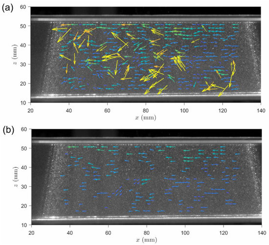 In regard to the measurement setup for the new algorithm, the experiment for an open channel flow in this study shows an approach for firing two laser sheets for illuminating the flow regions of interest as well as limiting the y position (normal to the measurement plane and FOV) of the obtained vectors. In this approach, the DOF has to be sufficiently deep, so all focal planes can be in-focus for achieving a higher signal-to-noise ratio in the cross-correlation result. Again, the deeper DOF would introduce a larger geometric error. As mentioned in Section 4.1, geometric error can be effectively reduced by time averaging and ensemble averaging.