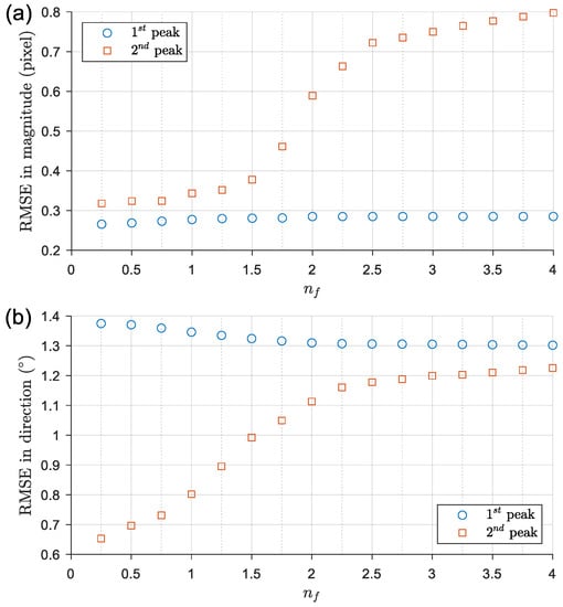 RMSE in (a) magnitude and (b) direction against different for the two velocity fields (corresponding to 1st peak and 2nd peak) derived from case PIVB. Note that the magnitude is converted from mm/s to pixel.