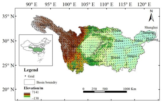 The YRB is the third largest river basin in the world and is one of the most important water resources in China. The YRB has a total area of approximately 1,800,000 km2 and is located at 90°33′ E-122°25′ E, 24°30′ N–35°45′ N [22]. The basin has a complex landform and appears as a three-level ladder, which, from upstream to downstream, reaches the Tibetan Plateau, Hengduan Mountains, Yunnan-Guizhou Plateau, Sichuan Basin, Jiangnan hills, and the plain of the middle and lower reaches of the Yangtze River. Thus, the basin has complex climate types, and most of the areas within the basin belong to a subtropical monsoon climate except for the Tibetan Plateau, which has an alpine climate [29]. Affected by the water vapor transport path and landform, the annual precipitation is heterogeneously distributed across the YRB with a decreasing trend from southeast to northwest. The annual precipitation in the source area of the Yangtze River is less than 400 mm, characterizing the area as an arid zone; most areas in the basin have an annual precipitation of 800–1600 mm, representing a humid zone. The special humid zone with annual precipitation greater than 1600 mm is located mainly in the western and eastern margins of the Sichuan Basin, Jiangxi, and parts of Hunan and Hubei. The semi-humid zone with an annual precipitation of 400–800 mm is located mainly in the western Sichuan Plateau, Qinghai, parts of Gansu, and the northern part of the middle reaches of the Han River. The rainy areas, with an annual precipitation of more than 2000 mm, are all distributed in small, mountainous areas [30]. Although the annual mean precipitation is approximately 1100 mm within the basin, due to the highly non-uniform distribution, 60–80% of the precipitation occurs from May–October [31]. The research area is shown in Figure 1.