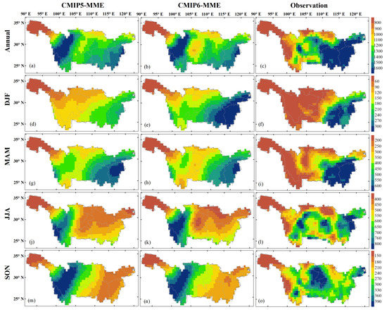 As illustrated in Figure 2, the maps compare the precipitation pattern over the YRB from 2015 to 2020. The precipitation spatial patterns of CMIP6-MME and CMIP5-MME were consistent with those of the observed data across seasons. The average annual precipitation in most areas of the YRB is greater than 1000 mm (Figure 2c). The high-value areas of regional average precipitation are mainly distributed in the midstream and downstream areas such as Hubei, Hunan and Jiangxi, and the low-value areas are mainly distributed in Qinghai, Tibet, and other upstream areas. As a whole, the spatial distribution of the average annual precipitation in the midstream and downstream areas is higher than that in the upstream areas, and the distribution trend of the southern region is higher than that of the northern region. However, as depicted in Figure 2a,b, the high-value areas of average annual precipitation both CMIP5-MME and CMIP6-MME occurred on the West Sichuan Plateau. The low-value areas of CMIP5-MME and CMIP6-MME are consistent with the observed data. In winter (Figure 2d–f), the precipitation decreases from southeast to northwest, and the low-value areas of CMIP5-MME and CMIP6-MME are mainly in Qinghai, and their spatial distribution is smaller than that of the observed data. The distribution of high-value areas, CMIP6-MME is closer to the observed data than CMIP5-MME. In spring (Figure 2g–i), the precipitation in the southeast area was the greatest. In summer (Figure 2j–l) and autumn (Figure 2m–o), CMIP5-MME and CMIP6-MME showed poor reproducibility of spatial patterns, and the areas with high precipitation values are distributed in the West Sichuan Plateau, but not in the central and upstream areas as shown by the observed data.