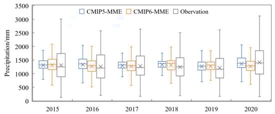Box plot of average annual precipitation of CMIP5-MME, CMIP6-MME and observed data for each year from 2015 to 2020.
