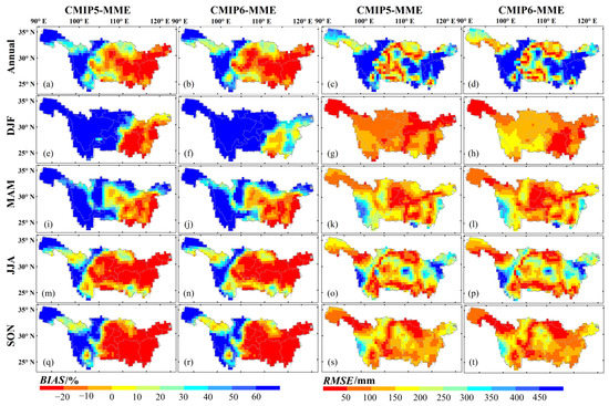 Figure 5 displays the average annual and seasonal precipitation relative biases and root-mean square errors through box plots between the MMEs’ data and the observed data. At an annual scale, the mean relative biases of the CMIP5-MME and CMIP6-MME were 23% and 18%, respectively. In winter, the mean relative biases of the CMIP5-MME and CMIP6-MME were 248% and 367%, respectively. In spring, the mean relative biases of the CMIP5-MME and CMIP6-MME were 86% and 70%, respectively. In summer, the mean relative biases of the CMIP5-MME and CMIP6-MME were 4% and 5%, respectively. In autumn, the mean relative biases of the CMIP5-MME and CMIP6-MME were 19% and 15%, respectively. The mean relative biases ranges of the CMIP5-MME, CMIP6-MME of annual and seasonal precipitation were −43–134%/−41–121% (annual), −51–759%/−26–994% (winter), −46–249%/−50–217% (spring), −59–94%/−56–93% (summer), and −59–171%/−56–155% (autumn).
