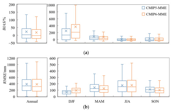 Box plots of relative bias (a) and root-mean square error (b) (projection minus observation) in CMIP5-MME and CMIP6-MME of annual and seasonal precipitation for the period 2015–2020.