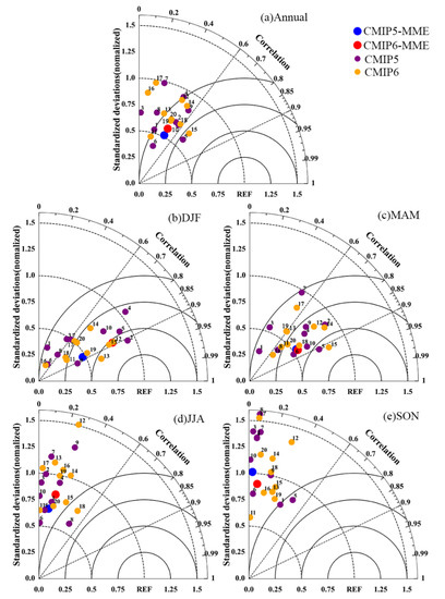 Figure 6 shows the performance of each GCM, and their ensemble means for both CMIP5 and CMIP6 sets in producing observational precipitation by the Taylor diagram for DJF (Figure 6b), MAM (Figure 6c), JJA (Figure 6d), SON (Figure 6e), and annual (Figure 6a). The high value of SCC indicates that the GCM has a reliable ability in projecting the spatial pattern of precipitation, and the standard deviation of the GCM is larger than the observed value, indicating that it overestimates the spatial variability of precipitation [37]. Based on 680 grid points across YRB, SCCs, normalized standard deviations (NSTDs), and normalized CRMSEs are 0.09–0.70, 0.46–0.97, and 0.15–0.31, respectively, for annual precipitation in the ten CMIP6 GCMs. Comparative analysis for seasons shows an excellent projection of all indices during winter relative to other seasons. Changes in the standard deviation will create extreme precipitation events in the future [38,39], and since the CMIP5-MME has a smaller standard deviation than that of CMIP6-MME except for SON, the likelihood of extreme precipitation events is higher in CMIP6 GCMs. It is noteworthy that the model FGOALS-g2 greatly underestimates the annual and seasonal spatial variabilities except for autumn with a very low normalized standard deviation of 0.18–0.53. In general, CMIP6 GCMs show the best performance in winter, owing to the best reproducibility of spatial variability, followed by spring and autumn, and the worst in summer due to the poorest reproducibility of both spatial pattern and variability. As a whole, concerning spring, summer, and autumn, the CMIP6 GCMs performed better, and concerning winter and annual, the CMIP5 GCMs exhibited better performance.