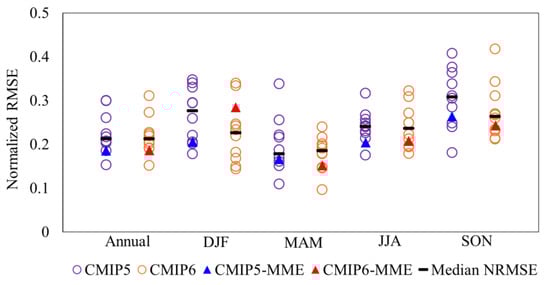 Normalized root-mean square error (NRMSE) in precipitation projection by CMIP5 GCMs (purple empty circles), CMIP6 GCMs (orange empty circles), CMIP5-MME (blue filled triangles) and CMIP6-MME (red filled triangles), as well as median errors (solid line).