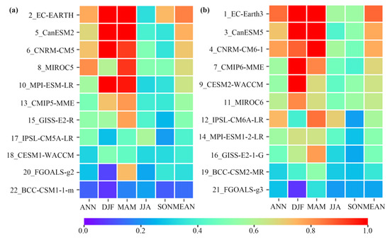 Portrait diagrams for TS score of the (annual, seasonal) mean precipitation in 2015–2020 by the CMIP5 (a) and CMIP6 (b) GCMs. From left to right are ANN, DJF, MAN, JJA, SON, and average means. The GCMs’ names listed on the left follow their ranks; The number before the name is the rank of the model among all GCMs.