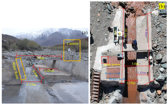 The hydrographic cross-section located in the Hulu watershed of the Qilian Mountains. (a) Cross-sectional view. (b) Vertical view. The camera in this figure is an infrared sensor camera called LTL5120A, which can automatically shoot continuously according to the set time interval, and the resolution of the photos taken is 2560 × 1920.