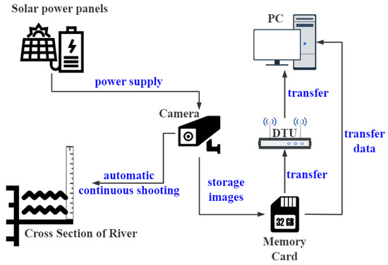 Figure 4 illustrates the schematic diagram of the collection system for the water level image. A water ruler was set on the cross-section of the river, where the video camera shot automatically. The camera is powered by a solar powered battery. The memory card in the interior of the camera is used to collect photos. These image data are then passed the DTU to the server or imported directly into the server by SD card.