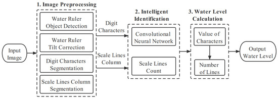 The water level image recognition system was based on image processing and CNN. Figure 5 shows the schematic diagram of the water level image recognition system, which can be divided into three stages: image preprocessing, intelligent identification and water level calculation.