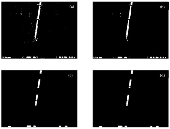 The effect after the opening and closing operation. (a) The image from Figure 7b by closing operation. (b) The image from (a) by horizontal opening operation. (c) The image from (b) by vertical opening operation. (d) The image from (c) by horizontal opening operation.