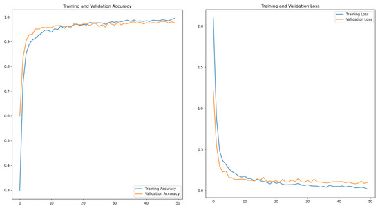 Figure 20. The accuracy (left) and loss (right) on training and validation. - Save the best training results as h5 model, evaluate the model and call it in the test phase.