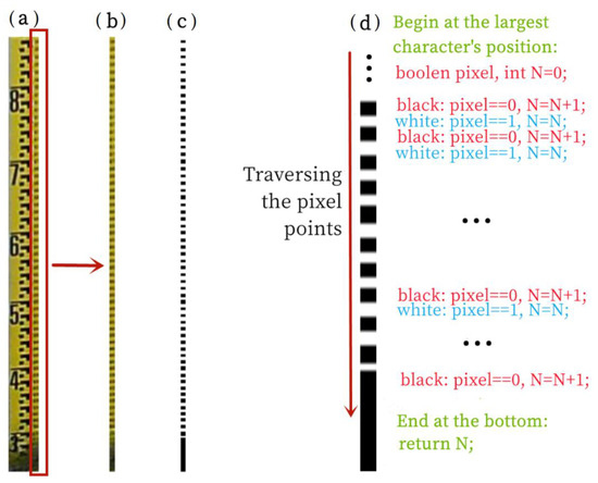 Going down through the pixels of the water ruler image after the binarization, the value N of the counter increases by 1 for every change of the pixel value, and the final value of the counter is the number of scale lines detected.