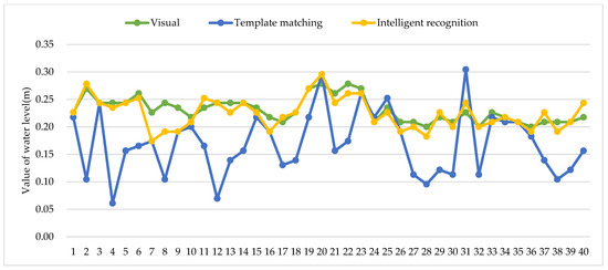 In order to meet the requirement of using the manually observed water level value as the standard value for the algorithm accuracy assessment, the images with good lighting conditions were selected from the photographs taken within fifteen days from 3 August 2017 to 18 August 2017, and 40 of them were randomly selected for the control experiment. In order to evaluate the performance of this method in terms of accuracy and speed, the experimental results of the template matching algorithm are added as a comparison. The template matching algorithm was one of the most representative methods in image recognition prior to the rise of CNN. It extracts a number of feature vectors from the image to be recognized and compares them with the corresponding feature vectors in the template library, calculates the distance between the image and the template feature vectors, and determines the category to which the image belongs by the minimum distance method. The manual reading, template matching algorithm, and intelligent recognition algorithm proposed in this study are used for control experiments.