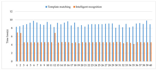 Comparison of time loss. The orange columns show the time loss of intelligent recognition. The blue columns represent the template matching. The ordinate represents the sequence number of the image and the abscissa represents the value of the time loss (the unit is s).