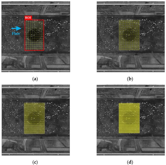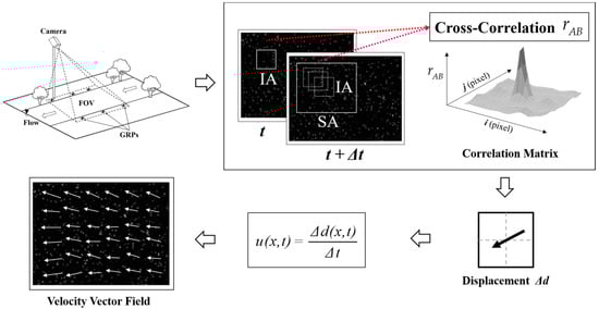 Large-Scale Particle Image Velocimetry (LSPIV) is a nonintrusive measurement that can obtain two-dimensional velocity fields (Figure 1) [,]. LSPIV measurements were performed using the consecutive images recorded by a fixed camera. Then, the surface velocity can be calculated by tracking the moving distance between the distinct pattern and the time difference in two consecutive images Equation (1).