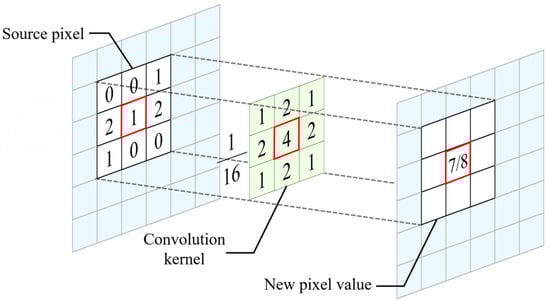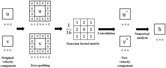 The distance the particle moves is calculated by the cross-correlation matrix obtained between subimage A at and each matching subimage B at . The peak value represents the location of the matching subimage B with the highest correlation with subimage A at , and the distance between A and B can be regarded as the displacement distance of the seeding movement. In addition, to reduce the excessive noise caused by the grid size of the two-dimensional velocity field, this study performs Gaussian Blur on the image before calculating. Gaussian smoothing is a nonuniform low-pass filtering of the image by the Gaussian function Equation (3), which can reduce the image noise, remove the negligible details in the image, and effectively reduce the error while calculating the water depth from the velocity field. A Gaussian kernel matrix of 3 × 3 and = 0.8 is used as a filter for smoothing. The original image is convolved with the Gaussian kernel (as shown in Figure 2 and Figure 3), and the data is smoothened by reducing the peak amplitude and increasing the low peak amplitude, resulting in a smaller amplitude.