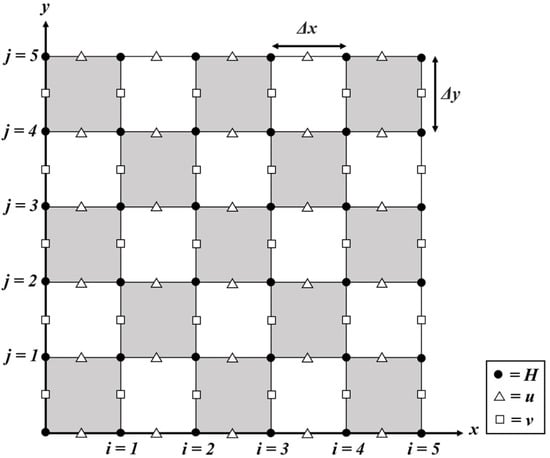 The finite difference method, named as the leapfrog method [,], was used to perform numerical operations from four different spatially interleaved grids. The continuous differential operator in the original partial differential equation would be replaced with the spatially discretized differential operator to obtain the discrete approximation. The accuracy of the numerical analysis depends on the density of the grid. In this study, the Arakawa C-grid was applied for numerical computation [,], and the water depth at the grid points was solved by the two-dimensional depth-averaged velocity field (as shown in Figure 4).