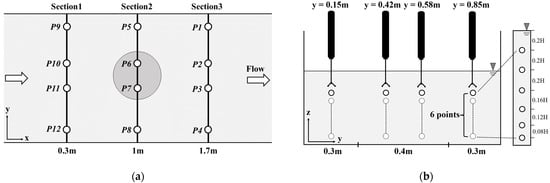 Measurement points, locations, and sections from ADV: (a) top view of the flume; (b) lateral view of the flume.