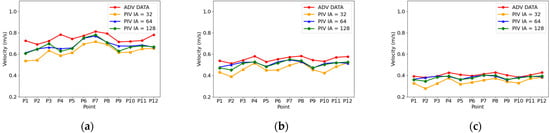 Surface velocities measured with IAs: (a) flume water level = 15.5 cm; (b) flume water level = 20 cm; (c) flume water level = 25 cm.