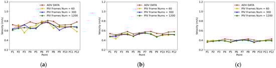 Surface velocities measured with different frames: (a) flume water level = 15.5 cm; (b) flume water level = 20 cm; (c) flume water level = 25 cm.