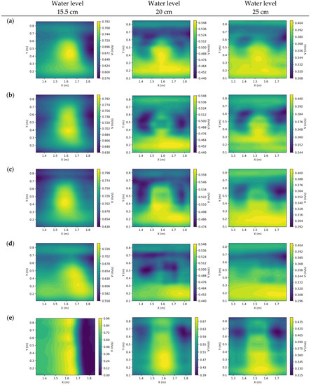 Velocity contour obtained by LSPIV: (a) saucer plate; (b) pie plate; (c) square plate; (d) triangle plate; (e) bump.
