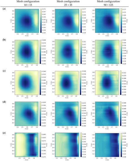 After obtaining the depth-averaged velocities by scaling the surface ones with a factor k = 0.85, Equation (6) can be used to calculate the water depth. At the center of the model, a rectangular area of 55 cm in length and 75 cm in width in the vertical direction was first selected as the region of interest (ROI) for numerical analysis. The effect of water depth and mesh density on the bathymetry calculation then was compared under three flow conditions of 15.5 cm, 20 cm, and 25 cm water depths, with 10 × 15 (about 5 cm2), 25 × 35 (about 2 cm2), 45 × 65 (about 1.08 cm2), and 90 × 125 (about 0.5 cm2) meshes under CFL conditions (as shown in Figure 9). The comparison between the physical model and the estimated bathymetry of the root-mean-square error (RMSE) of the vertical and horizontal elevation profiles was used to evaluate the reliability of the proposed method.