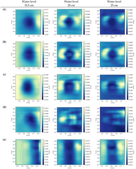 Figure 13 shows the two-dimensional surface velocity fields calculated using particle images with differently shaped bed models at different water depths. Additionally, the length represents the flow direction and the width represents the cross direction of the flume. The movement of the flow is from left to right, and the center coordinates of each model are located at (1.588 m, 0.482 m). When the water depth is 15.5 cm, the flow field in the downhill section behind the bump model changes from a subcritical flow to a supercritical flow due to the shallow water, resulting in a hydraulic jump, which causes the particles to be swept in and lose trackability, and which clearly distorts the 2D surface velocity calculation. When the water depth is 20 cm, the difference between the high and low velocities of the velocity field becomes more obscure, especially for the surface velocity profile of the triangular bottom bed. It was initially concluded that the surface velocity did not accelerate as much as expected because the model itself was the smallest among all. In addition, the model was installed with the triangular tip toward the upstream direction, which makes the overall shape more streamlined. The flow through the model is thus less disturbed and cannot adversely affect the surface flow field. When the water depth reaches 25 cm, the bottom bed model has less influence on the surface velocity.