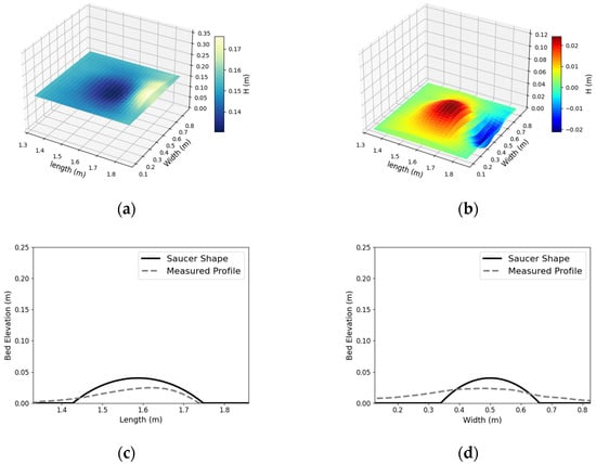 Bedform measurements of the sauce plate with water level = 15.5 cm: (a) water depth measurements; (b) bed elevation measurements; (c) longitudinal profile comparison; (d) lateral profile comparison.