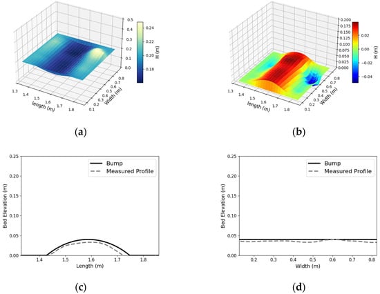 Bedform measurements of the bump with water level = 20 cm: (a) water depth measurements; (b) bed elevation measurements; (c) longitudinal profile comparison; (d) lateral profile comparison.