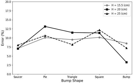 Figure 16 shows the comparison of the error of the bed elevation measurements. The results show that, when the water level was shallow, applying the proposed method could obtain relatively good results. However, when the water level gradually increased, the physical properties of the continuity equation were reduced and might cause errors. It is inferred that the three models’ (pie, square, and triangular plates) abrupt changes in their edges would affect the surface velocity and interfere with the elevation calculation results. Additionally, the velocity profile above the model is affected by intersecting with the lateral flow caused by the shape of the bedform. The incident will decrease the overall surface velocity and underestimate the bed elevation. As for the saucer plate and bump, the edges changed progressively without obvious ridges, and the bump was across the section, which distributes less influence by lateral flow; therefore, the bed elevation and water depth measurements were close to the actual observation (Figure 17a,b and Figure 18a,b). The comparison of bed profiles demonstrated that the proposed method can accurately delineate the bedform (see Figure 17c,d and Figure 18c,d).