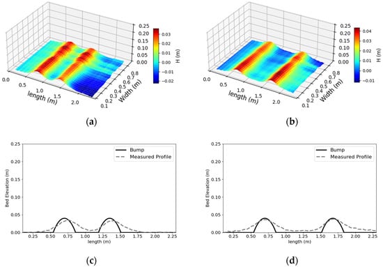 Bedform measurements of the composite bed structures: (a) spacing = the width of the bumps; (b) spacing = 2 times the width of the bumps; (c,d) bed elevation profile comparison.