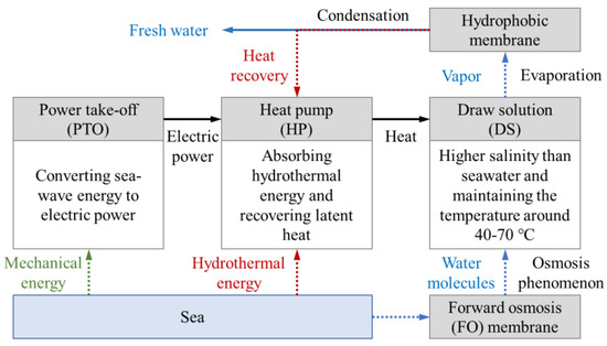 The working principles of the desalination process of WavoWater are described in Figure 1. The mechanical energy of wave motions is converted to electric power by a power take-off (PTO) device to provide electricity for the heat pump (HP) operation. Next, the hydrothermal energy of seawater is collected by the HP to heat up the draw solution (DS), which always maintains a higher concentration than the surrounding seawater body. The DS creates a natural osmotic pressure between two solutions so that water molecules of the seawater can penetrate the forward-osmosis (FO) membrane and move to the DS. Then, water vapor flux is created from the DS to the air gap by the vapor pressure difference between the two sides of the MD membrane. The MD membrane is hydrophobic so that only water vapor is allowed to pass through the MD membrane pores from the feed to the permeate side. Finally, the vapor in the air gap is condensed and collected after contacting the cooling surface provided by the HP system. The latent heat recovered during the condensation is reused for heating the DS. This working process is designed to be continuously operated as long as the electrical power is supplied enough by the sea wave motions, and it can be described that WavoWater consists of five key processes to produce fresh water from the sea water: