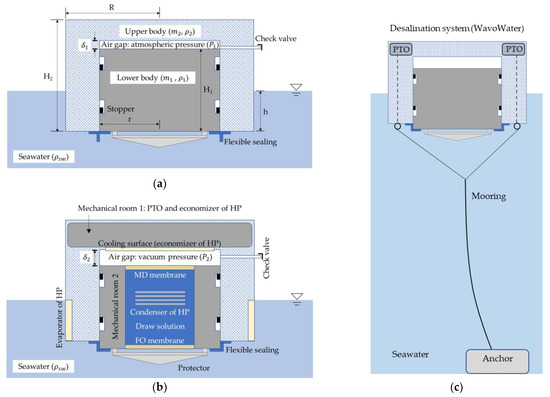 Figure 2. The concept of the wave-powered desalination system consisting of two different density bodies (p1 > p2): (a) atmospheric pressure status of the air gap when the upper and the lower body are closest; (b) sub-atmospheric condition of the air gap due to the volume expansion caused of the density difference; (c) mooring system of WavoWater.