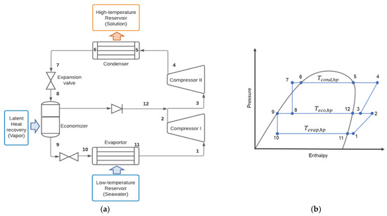 Figure 3. Two-stage HP with an economizer [29] for WavoWater: (a) Schematic diagram, (b) cycle in P-h diagram.