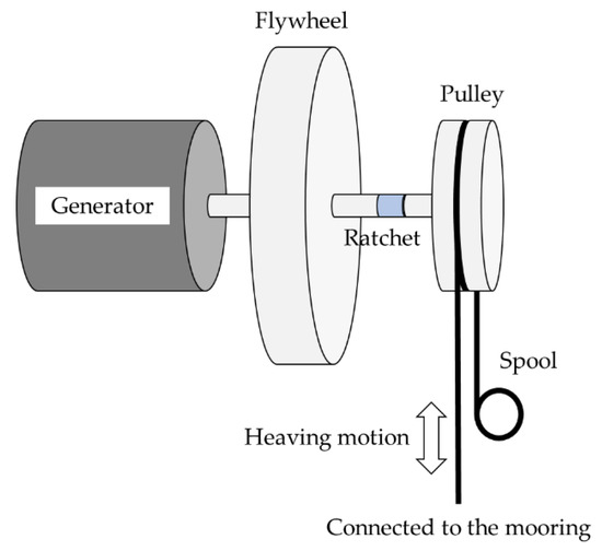 There are numerous methods to generate electric power or mechanical work from oceanic energy. This paper reviews surface wave motions to extract energy to operate the desalination system, WavoWater. A WEC can convert the wave energy directly into electricity to operate the system. The proposed concept was reviewed to supply power to the heat pump system as a single-body point absorber. Among single-body point absorbers, some studies [32,33] applied a flywheel energy storage (FES) device (Figure 4) and demonstrated its superiority in terms of energy harvest and efficiency. Therefore, a WEC combined with a flywheel was considered for the desalination system.