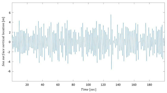 The wave frequency and amplitude of randomized waves were generated (Figure 6) using MATLAB and used as input values of the main simulation program to estimate the power of the system. The mean wave period, T m e a n , is the mean of all wave periods in a time series representing a specific sea state, and the mean wave frequency is the reciprocal of the mean wave period ( f m e a n = 1 / T m e a n ).