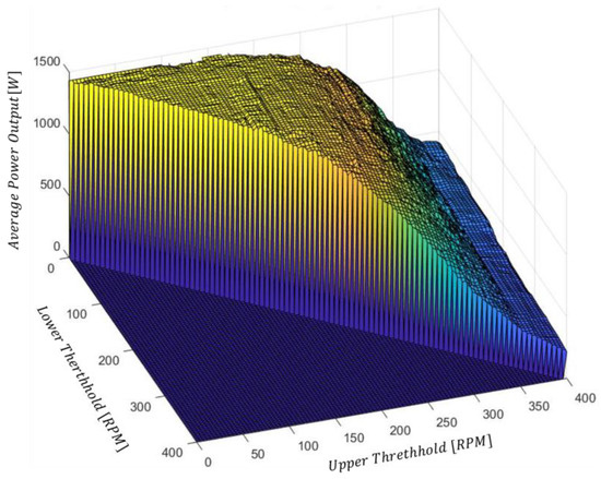 Considering the negative effect of the back-torque, Helkin (2011) [37] showed that the FES-based WEC system could increase the average power output by controlling the generator load. The lower and upper threshold values were examined to optimize the FES-WEC system—i.e., the lower threshold value is the rotor velocity (revolutions per minute, RPM) to be disengaged between the FES and generator, and the upper threshold value is the value to be engaged. By using Helkin’s model and method in MATLAB, we analyzed the average power output of WavoWater. As the result of 200 cycles of iteration, the mean value of average power was estimated, as Figure 7 shows. It should be noted that the point equaled to zero represents the status without load control. Moreover, the load control status remains the same as its previous state until the RPM falls below the lower threshold value or increases above the upper threshold. The upper threshold value is always equal to or above the lower threshold parameter. From Figure 7, the maximum average power output (1.45 kW) is obtained when the FES is controlled within the optimal lower and upper threshold values, 28 and 76 RPM, respectively.