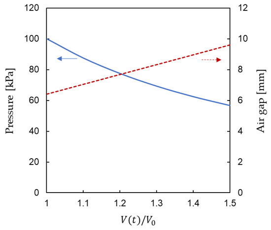 Figure 8. The change of the pressure and the gap thickness according to the volume change of the gap between the upper and the lower bodies of WavoWater.
