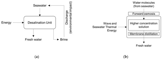 Figure 13. Comparison between (a) a conventional desalination system and (b) WavoWater.