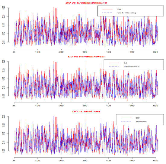 Looking at the predictions of the initial modeling, the data include 152 instances, 11 variables, and 9 features (no missing values), and the target variable is DO. The 3 models used were gradient boosting, AdaBoost, and random forest (