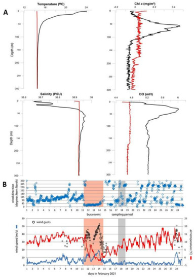 Environmental parameters at the sampling station in June 2020 (black line) and February 2021 (red line) (A), and meteorological conditions in February 2021 (B).