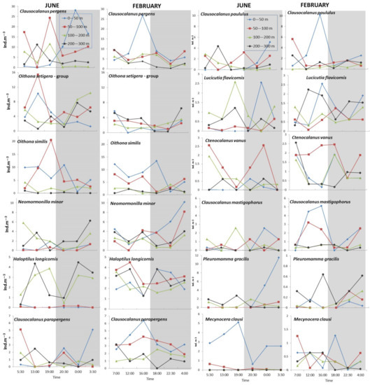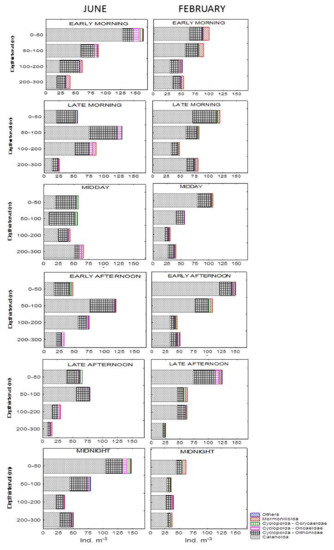 Diurnal vertical abundance profiles of the taxa with a contribution greater than 1% are presented in Figure 5. The dominant copepod genera were Clausocalanus and Oithona, especially in the upper 100 m. Among the eight species of the genus Clausocalanus found in the area, those with higher abundances were: C. pergens (with a peak abundance in the surface layer at midnight (June) and late afternoon (February); C. parapergens (with a peak in late morning/early afternoon in the 0–50 and 50–100 m layers, respectively in June, and late afternoon in the 0–50 m layer in February; C. paululus (whose peak was in the surface layer of both seasons, in late morning in June and late afternoon in February) and C. mastigophorus (with considerably higher abundances recorded in February, especially in the upper 100 m during the daylight). During the strongest daylight (midday) in June, the Clausocalanus species avoided the upper 100 m depth. Furthermore, C. parapergens, C. paululus and C. mastigophorus showed distinct, although not significant, seasonal WMD variations and exhibited deeper WMD in June (Table 1). Their copepodite stages were relatively numerous in both seasons. The Oithona setigera group was more abundant in June, when, except for the surface layers during the day, they also showed higher abundances in the deeper layers over the night. O. similis was constituted by the bulk of the population occurring in the 0–100 m layer in both seasons. During June, Neomormonilla minor remained in the deeper layers, while in February, considerably higher numbers were recorded up to the surface during the night–late morning. Haloptilus longicornis showed significant seasonal variations in vertical distribution and was constituted by the bulk of the population occurring below 100 m in July. In February, this copepod was more uniformly distributed in the upper 300 m of the water column. Lucicutia flavicornis and Ctenocalanus vanus are copepods whose WMD generally did not differ between the seasons, although they had different diel patterns between seasons. L. flavicornis reached maximum abundance in the late afternoon (100–200 m) and night (0–50 m) in summer, thus avoiding surface layers during the strongest insolation. The winter peak for this species was recorded at the surface in the early afternoon. During the winter, C. vanus was consistently abundant in the 50–100 m layer. A strong migrant P. gracilis performed surface migration only in June, while during February the majority of the population remained in the 200–300 m layer. For both adults of P. gracilis and Pleuromamma copepodite stages, WMD was observed deeper during the winter mixing. Similar vertical movements were recorded for P. abdominalis as well as for another intermediate water copepod—Euchaeta acuta, performing standard DVM movements only during the stratification period. Mecynocera clausi occupied surface layers in June with a peak in the late afternoon, while during February, it was more or less evenly distributed through the investigated layers.