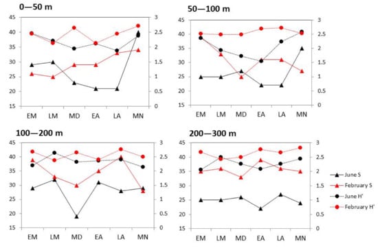 Vertical distribution of the number of taxa (S, left y-axis) and Shannon–Wiener index (H′, right y-axis) for each sampling time (EM—early morning, LM—late morning, MD—midday, EA—early afternoon, LA—late afternoon, MN—midnight) at four depth layers in June 2020 (black lines) and February 2021 (red lines).