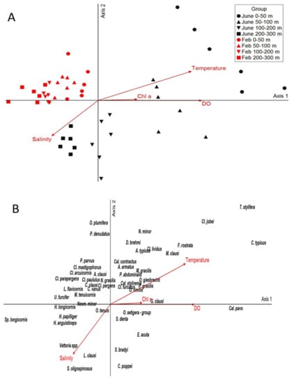 Ordination joint plot from the non-metric multidimensional scaling (NMDS) of copepod abundance and four environmental variables recorded in June 2020 and February 2021 in the south Adriatic Sea. The NMDS sampling stations per layer and environmental vectors (A) and species (B) are equally oriented.