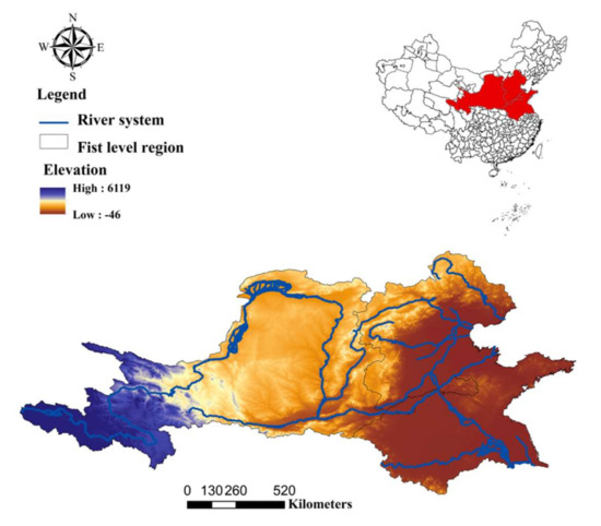 The Huang-Huai-Hai River Basin is the general name of three first-level water resource regions in China, the Yellow River Basin, Huaihe River Basin, and Haihe River Basin, as shown in Figure 1. It is located at 95°53′–122°60′ E and 32°10′–43° N. The basin consists of 16 provinces and 128 cities in China. There are many important political and cultural centers, major agricultural production areas, and important nature reserves in this basin, so it plays a crucial role in China’s long-term development strategy. However, there is a serious shortage of water and land resources in the Huang-Huai-Hai River Basin [30,31]. The water and resources that were considered for this study refer to the total available surface water and land area in the basin. For such an important basin, with scarce water and land resources as well as unbalanced distribution of the two, we need to understand the matching pattern between the water and land resource system in both time and space to provide a scientific basis for the planning and utilization of the water and land resources together as a whole system to improve the management efficiency.