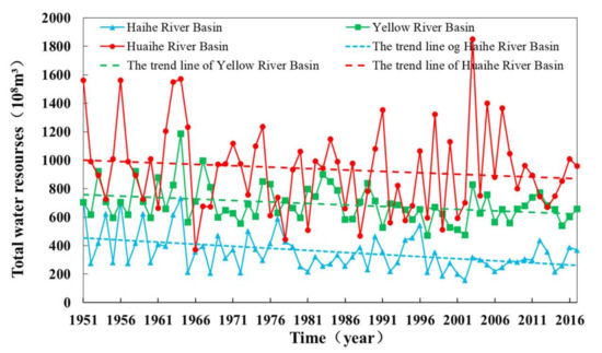 The temporal changes in the total water resources, which means the available surface water in the three first-level regions in the Huang-Huai-Hai River Basin during 1951–2017, are illustrated in Figure 1. Among the regions, the Huaihe River region has the largest annual average water resources with about 92.85 billion m3, followed by the Yellow River region, and Haihe River region, with values of 69.26 billion m3 and 34.86 billion m3, respectively. The total water resources of the Haihe River region showed the most significant decreasing trend (p < 0.01), with a trend slope of −2.6, followed by the Yellow River region with a trend slope of −2.08. The water resources of the Huaihe River region changed slightly with no significant trend (Figure 2).